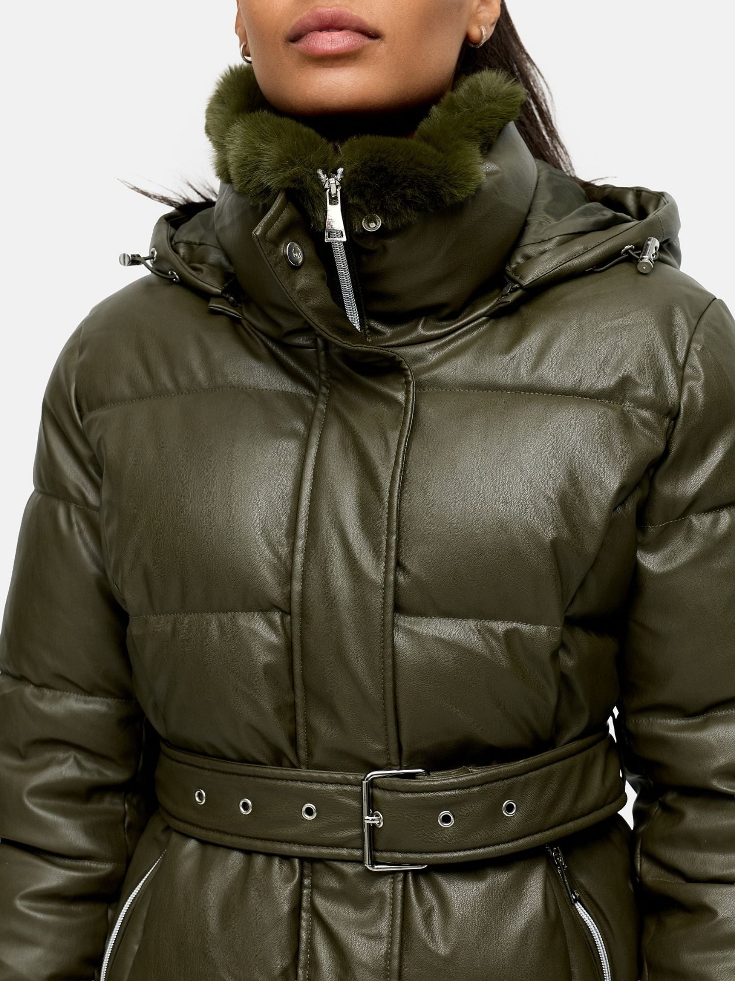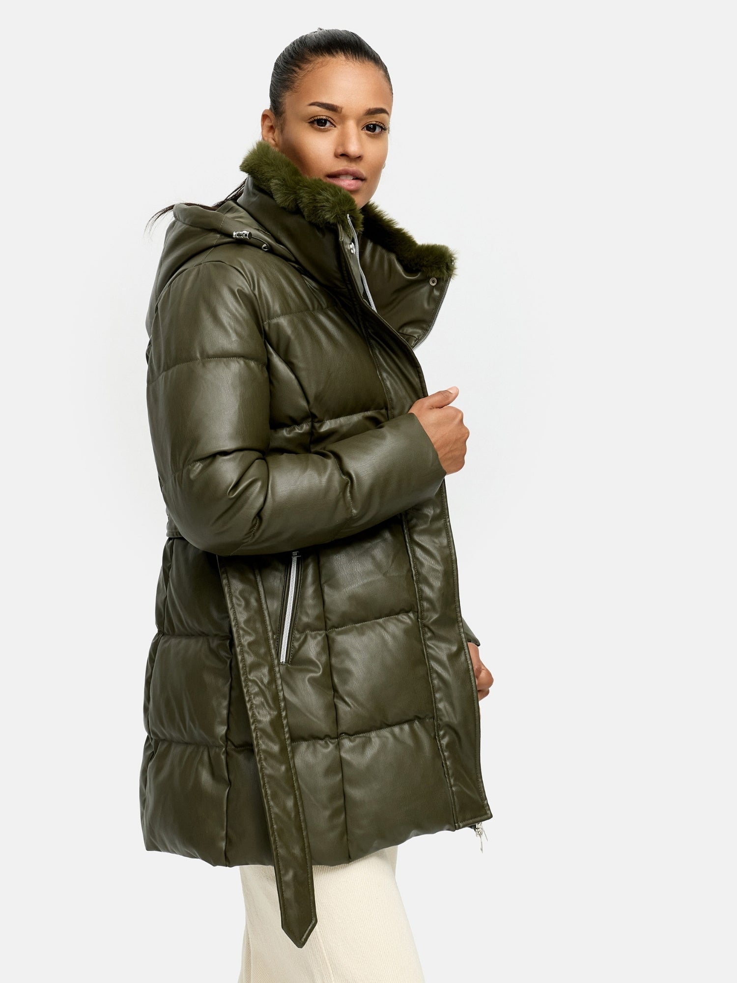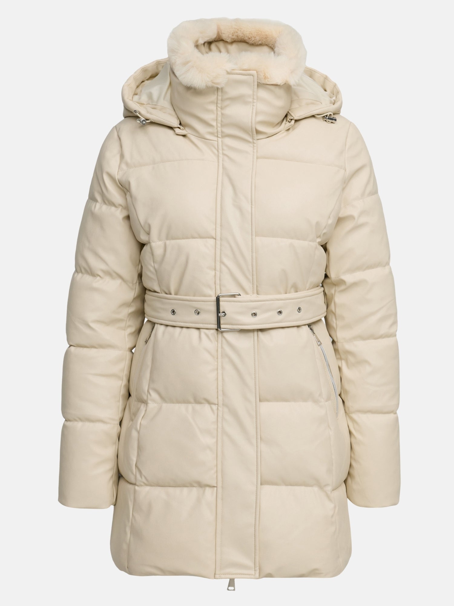 - Details: Zusätzliche Druckknopfleiste, abnehmbarer Taillengürtel mit Metallschnalle, Kapuze mit Kunstfellbesatz
