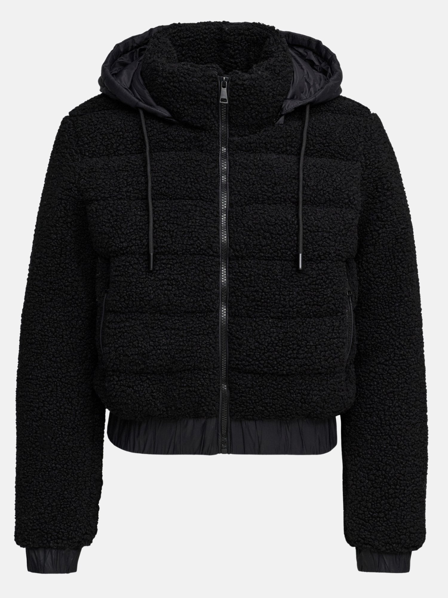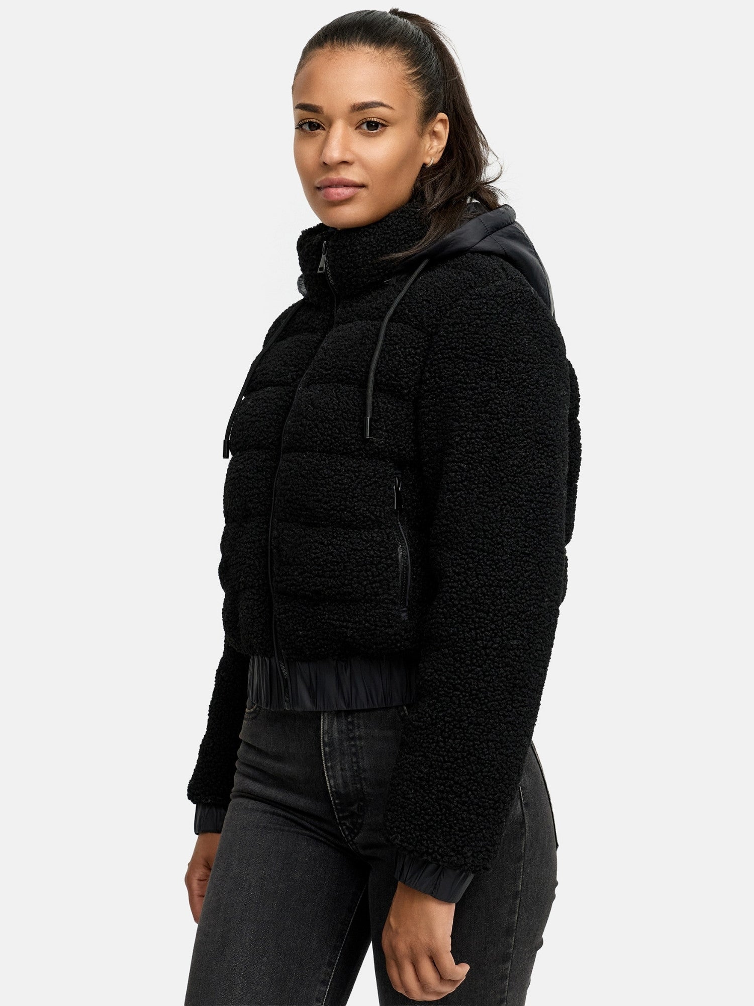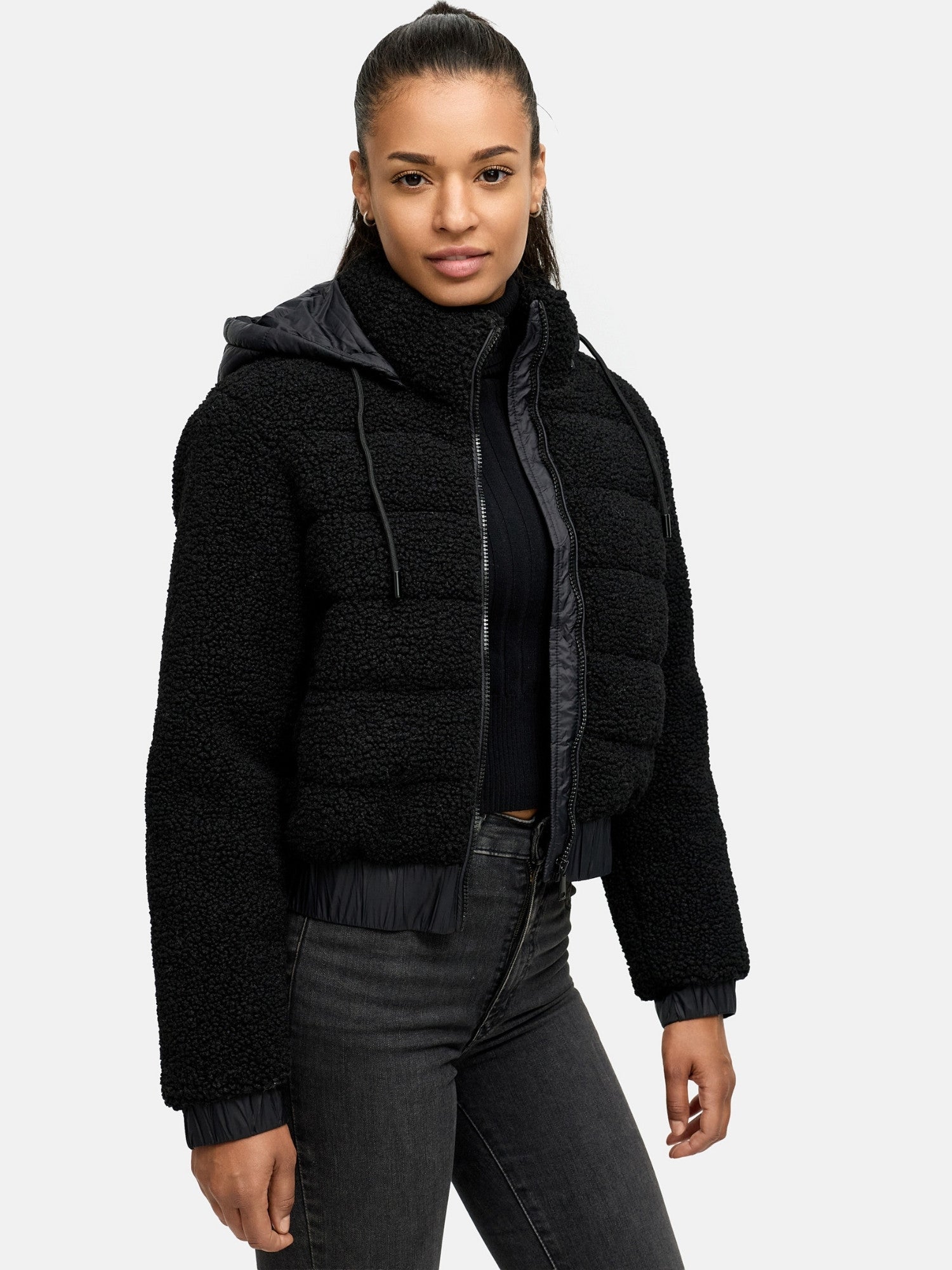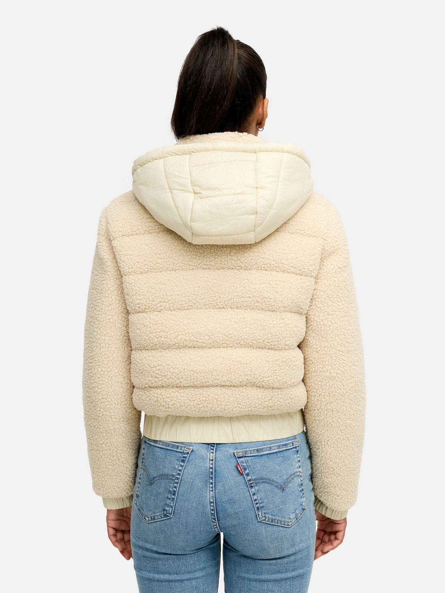 - Details: Komplett Teddy-/Sherpa-Material, horizontale Steppungen, Rippbündchen an Ärmeln und Saum, Bomber-Schnitt